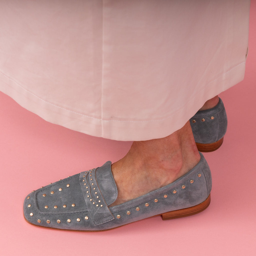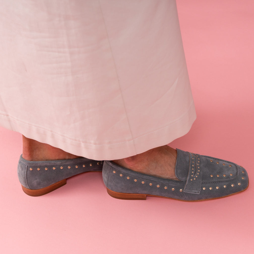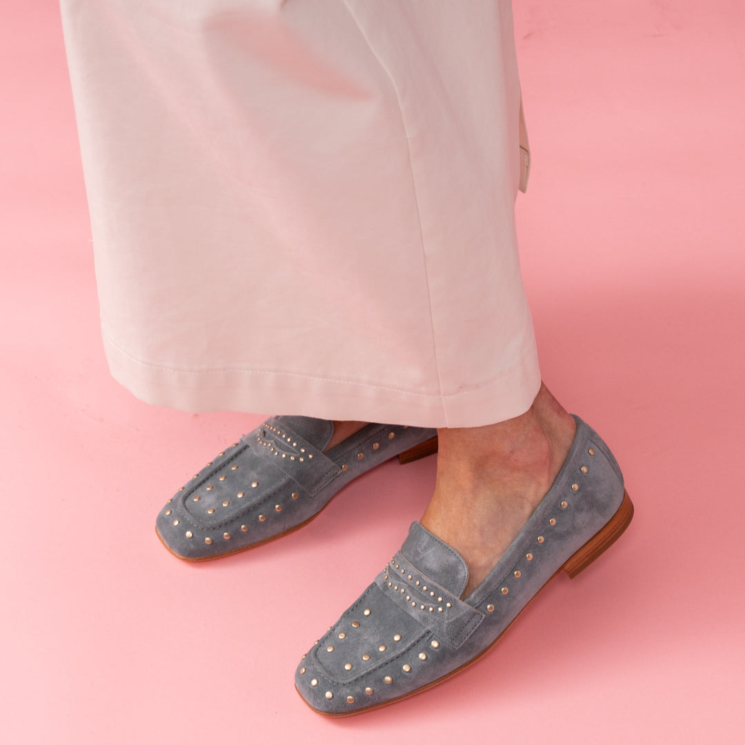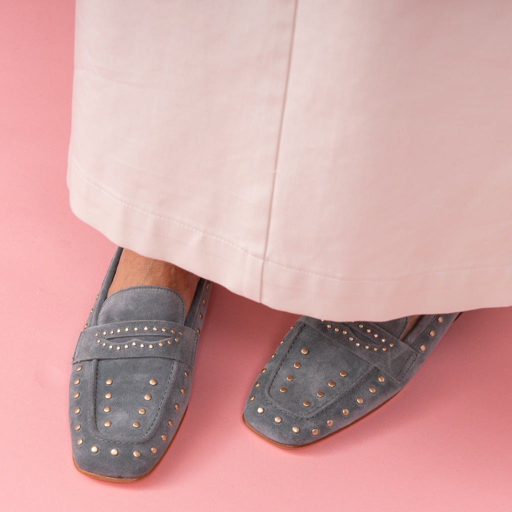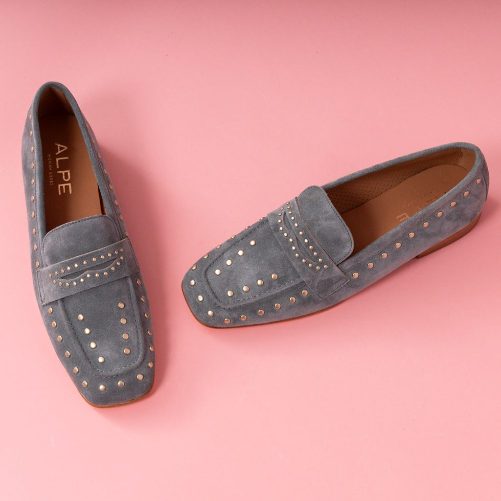 Classic with a touch of edge, the Belize loafer by ALPE is a refined twist on a timeless silhouette. Crafted in soft slate-blue suede, its sleek profile is adorned with delicate silver-toned studs — adding a subtle shimmer and modern charm.