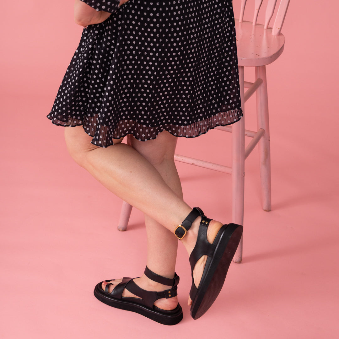 Made from supple black leather, this design features bold crossover straps, a modern toe loop, and a softly padded footbed for effortless comfort. The sculpted platform sole and statement gold buckle bring a sense of polish to its laid-back silhouette — a sandal that feels as good as it looks. The ankle strap can easily be removed or left on for an alternate look.