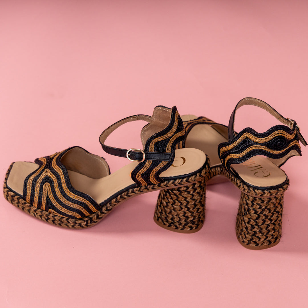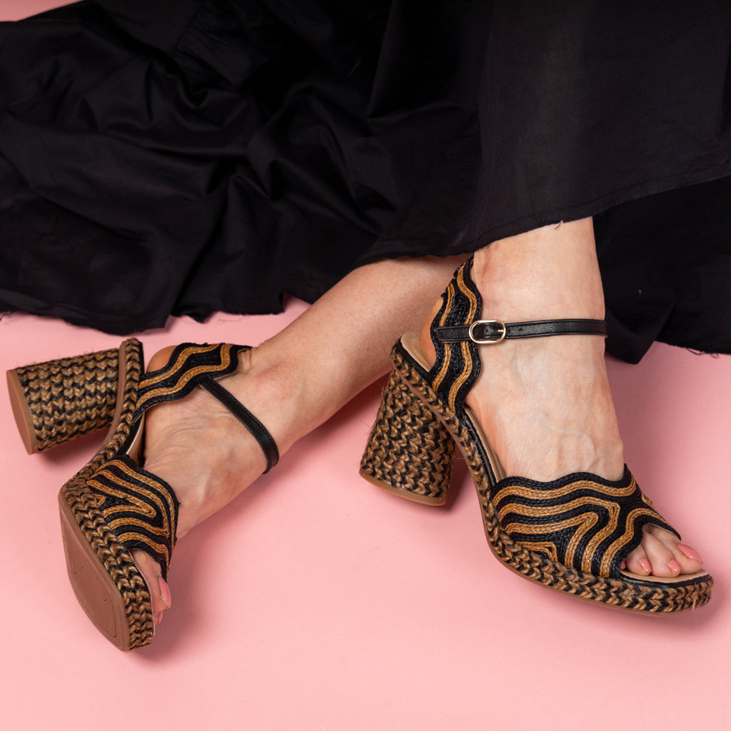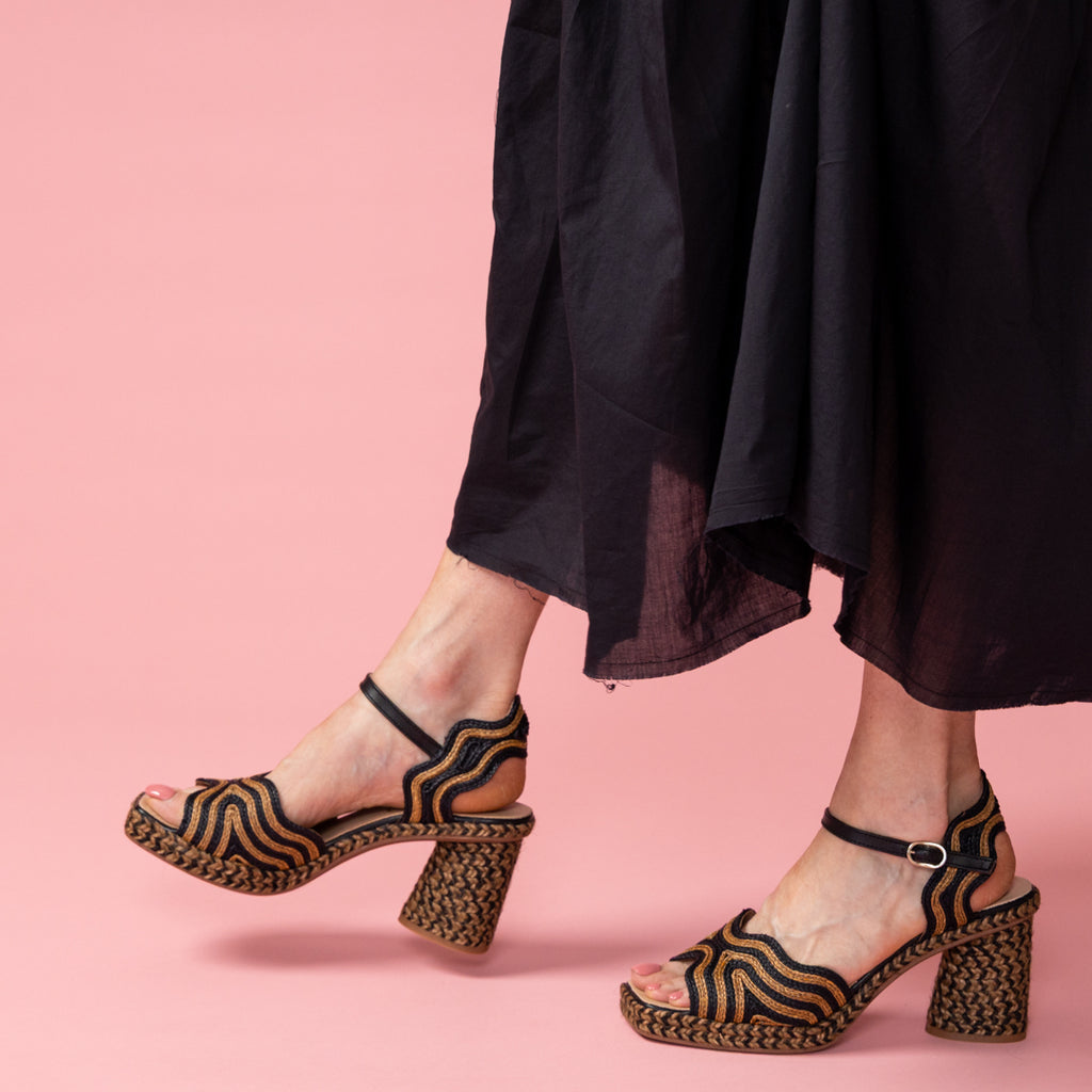 Last season’s sell-out style, Danae, is BACK! Handcrafted in Spain, this Gaimo sandal brings bold texture and effortless glamour with its sculpted block heel and artful woven pattern in black and warm caramel. The ankle-strap silhouette delivers both stability and easy elegance, while the intricate braided platform keeps every step cushioned and confident.
