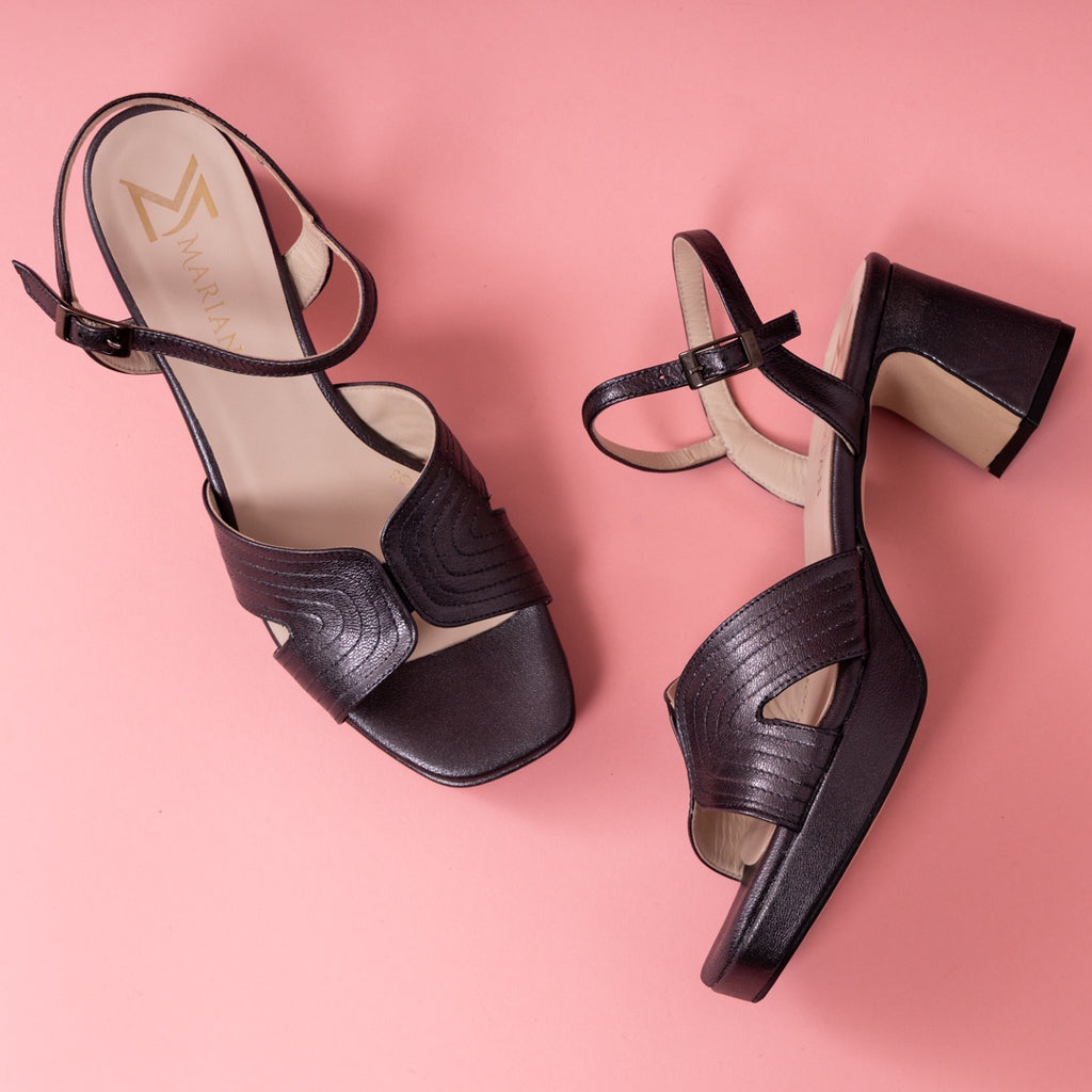 Modern glamour meets everyday wearability in this striking and versatile platform sandal from Marian. Crafted in Spain in a glimmery black leather, the design combines bold colour with architectural lines for a statement finish.