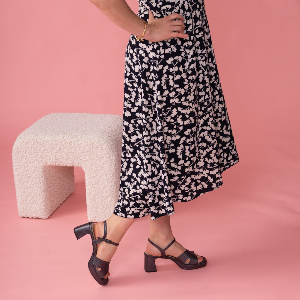 The retro-inspired block heel and platform sole bring both height and comfort, while the delicately cut straps add femininity and balance to the structured shape. A slim ankle strap secures the fit, ensuring confidence with every step.