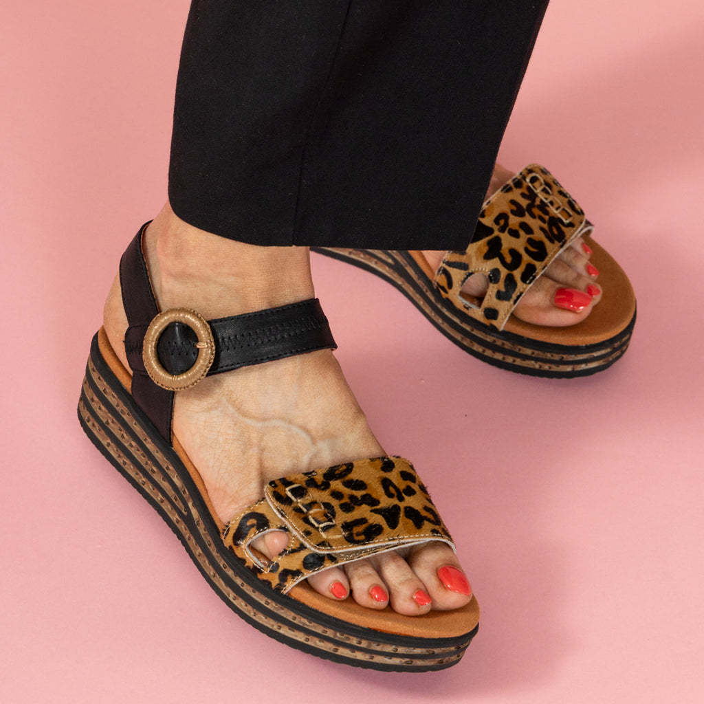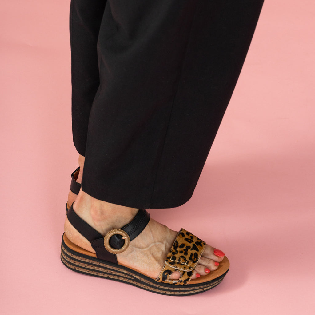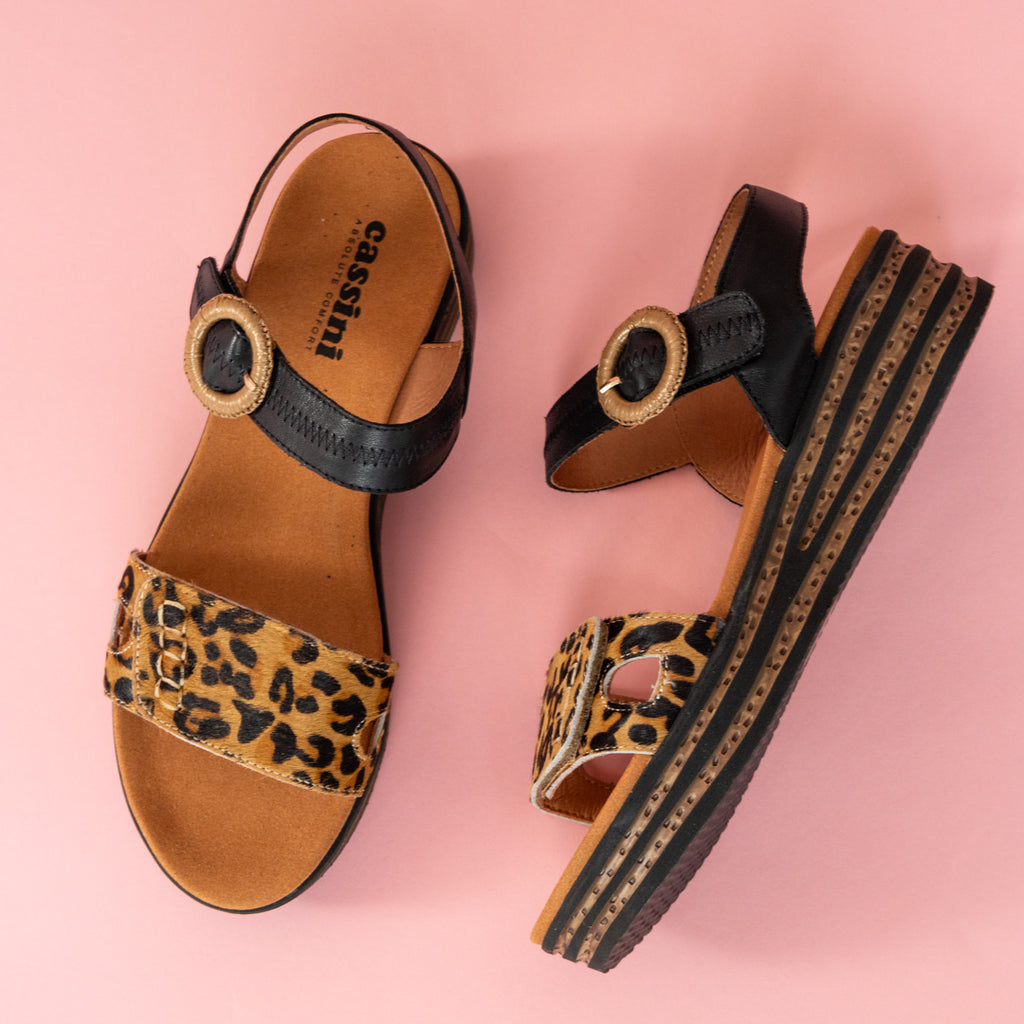 Wildly wearable and endlessly versatile — the Cassini Wedge blends bold personality with everyday comfort. Crafted in soft suede and leather with an adjustable strap and eye-catching woven buckle with velcro, this style redefines the modern casual sandal. The touch of leopard print across the forefoot adds a confident edge, while the cushioned insole and lightweight platform sole ensure all-day ease.