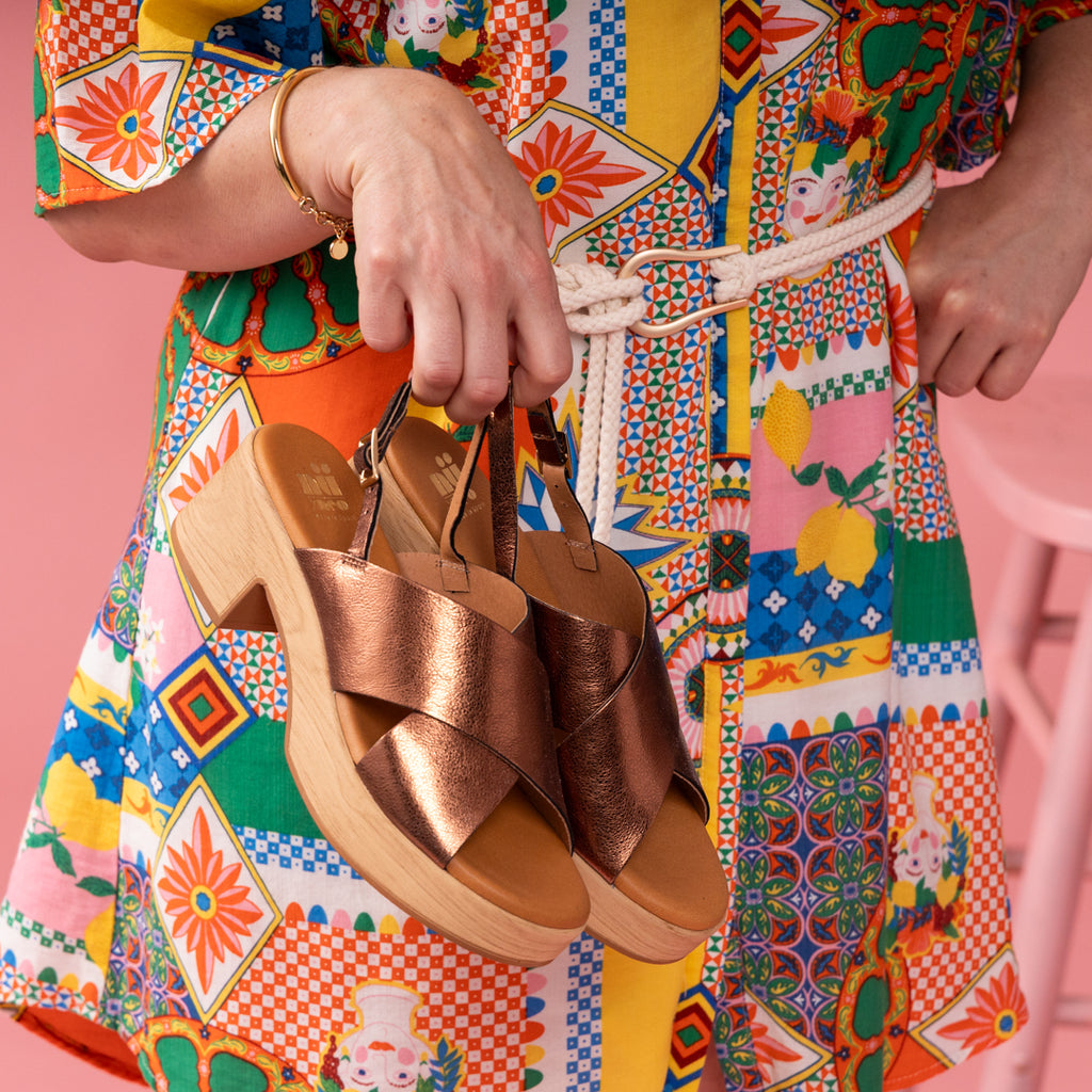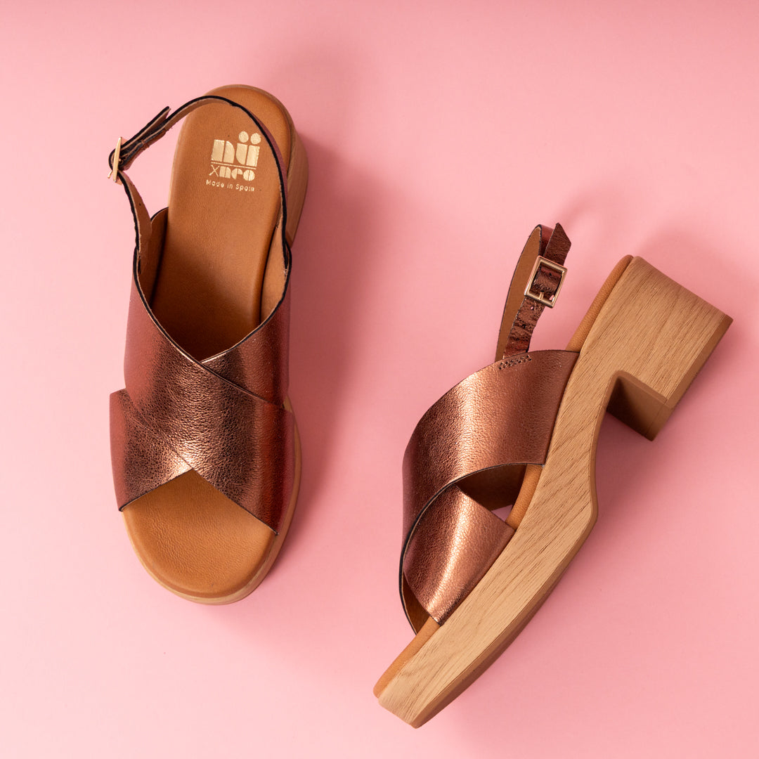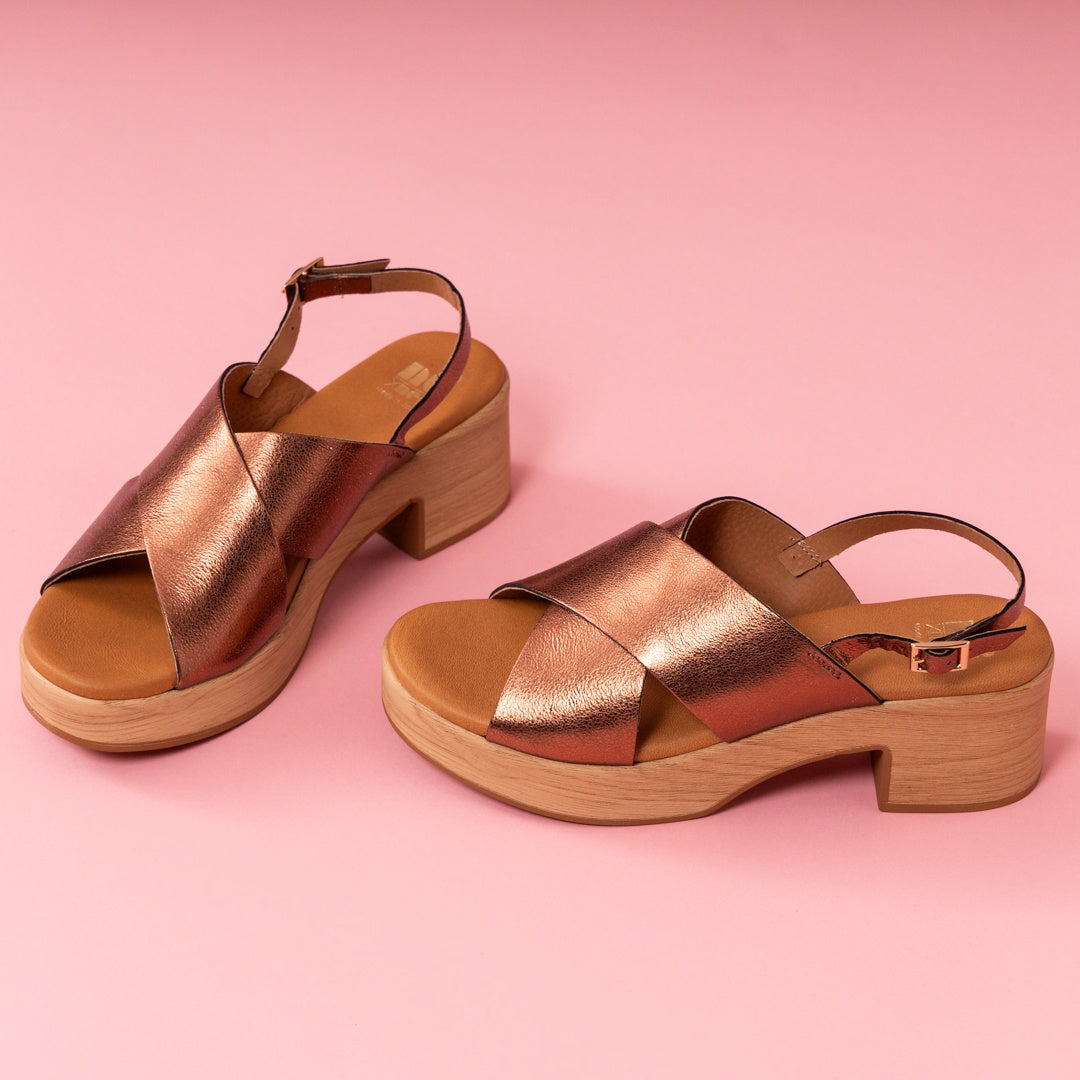 Handcrafted in Spain, this standout sandal features wide crossover straps in a gleaming bronze metallic leather — a tone that shifts beautifully between copper and rose gold in the light. Set on a sculpted wood-look platform with a gently curved heel, it offers both lift and stability for day-long comfort.