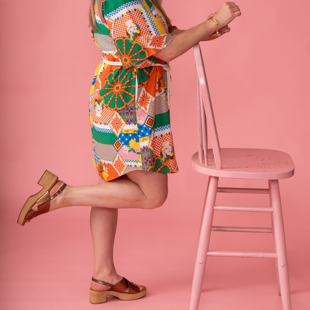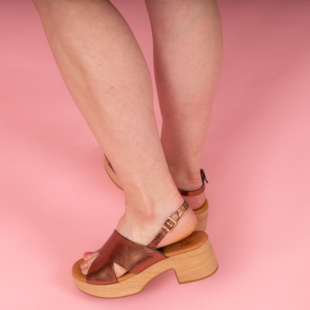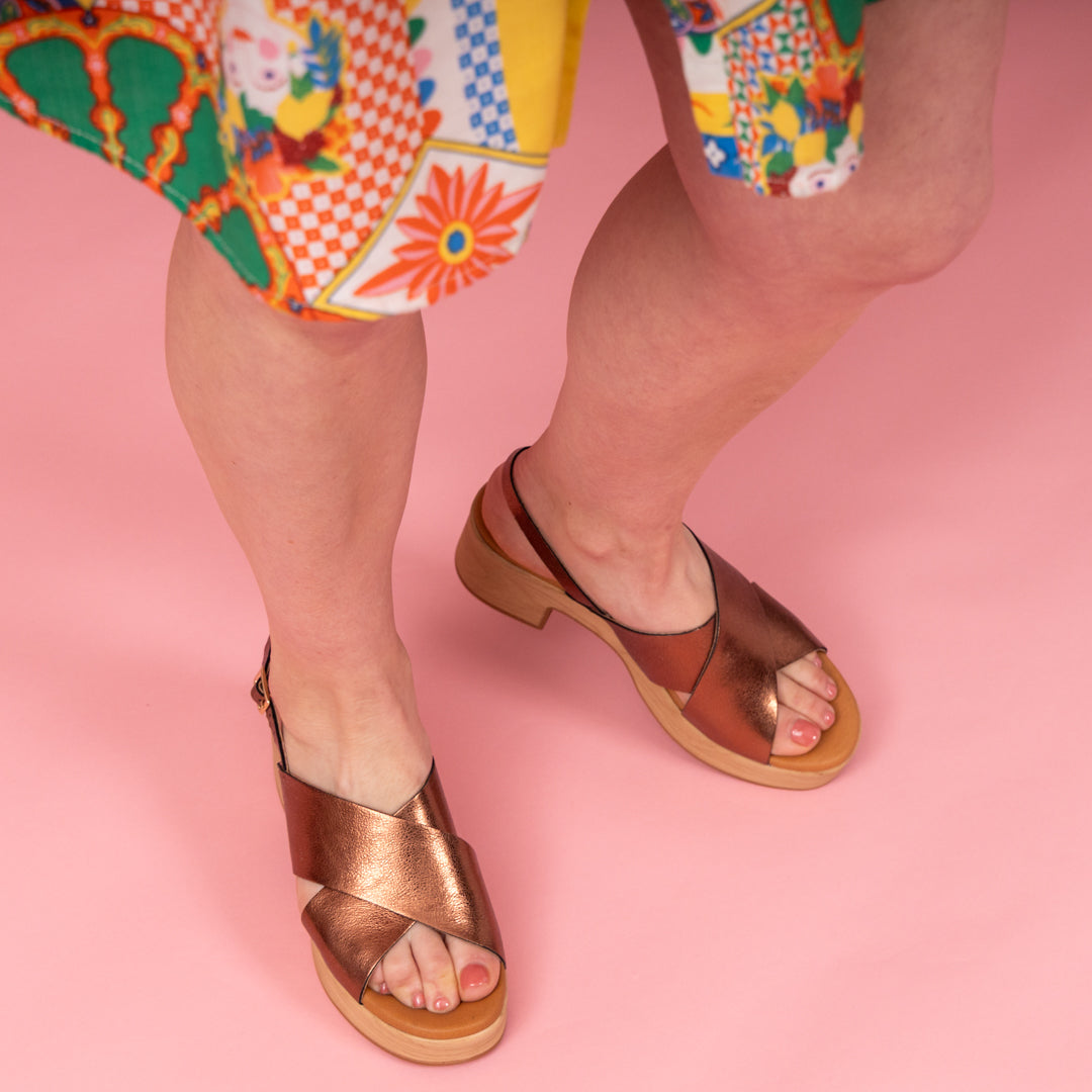 Handcrafted in Spain, this standout sandal features wide crossover straps in a gleaming bronze metallic leather — a tone that shifts beautifully between copper and rose gold in the light. Set on a sculpted wood-look platform with a gently curved heel, it offers both lift and stability for day-long comfort.