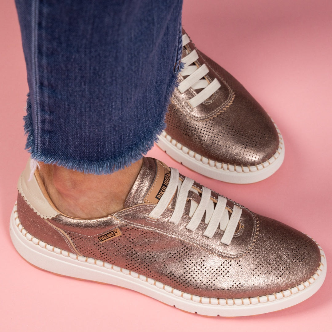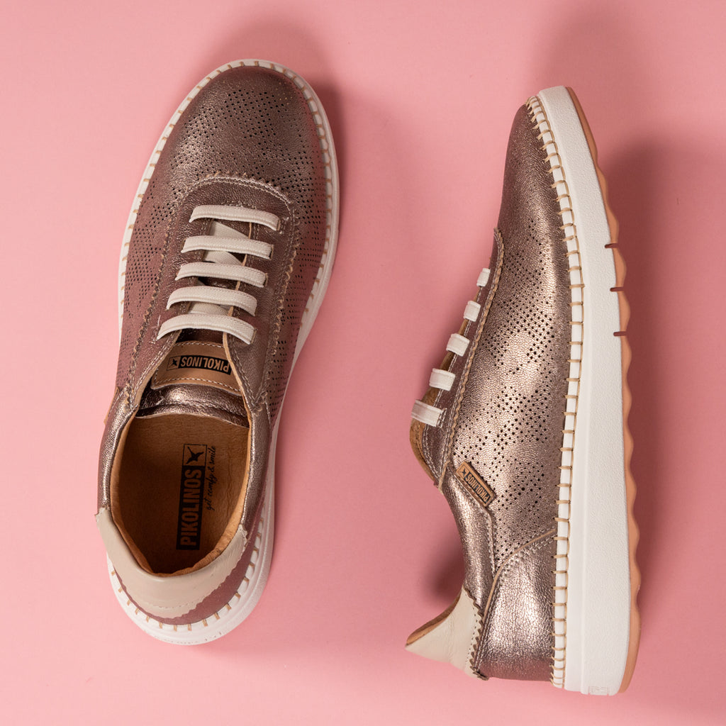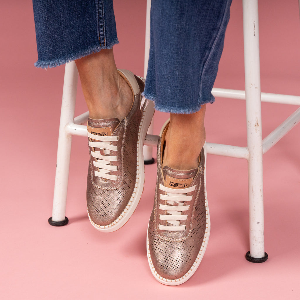 A sneaker with a touch of radiance—Pikolinos brings effortless glamour to off-duty dressing with this metallic leather design. The perforated finish keeps things light, while cream elastic laces and contrast stitching highlight the brand’s signature craftsmanship. A cushioned and moulded insole ensures day-long comfort, making these as practical as they are polished.