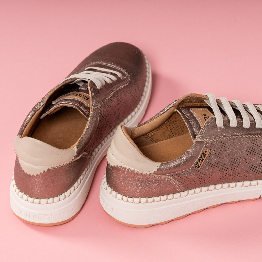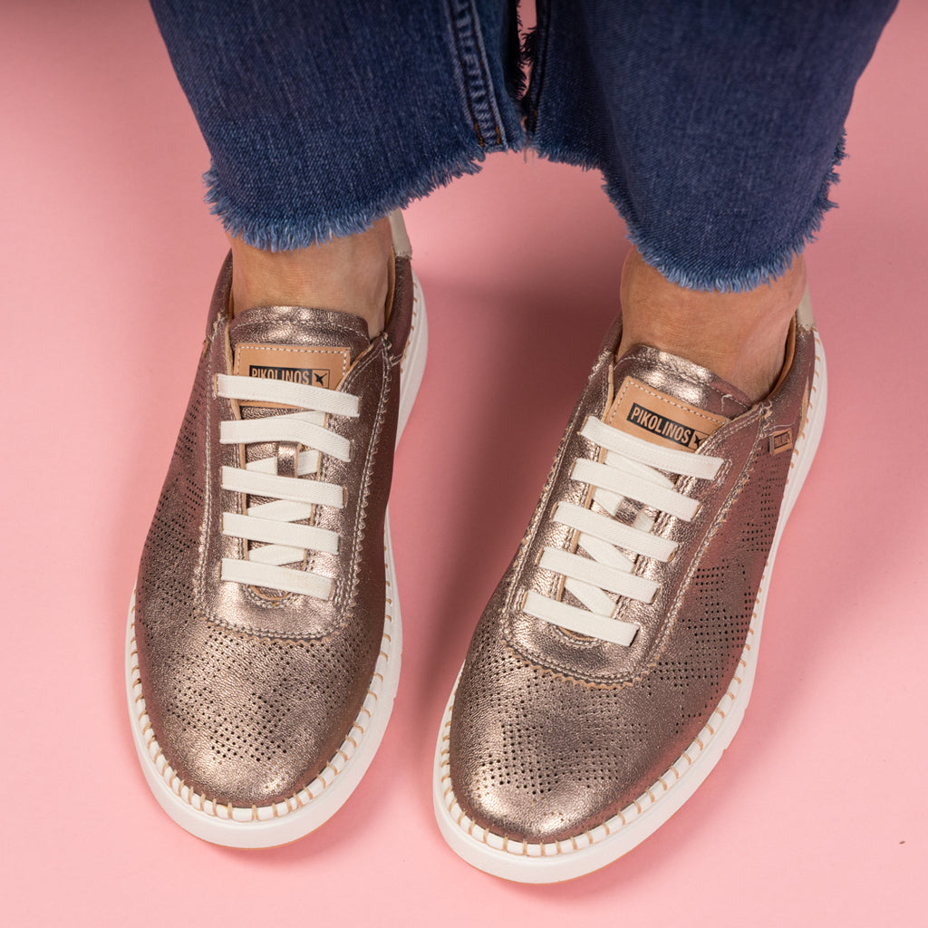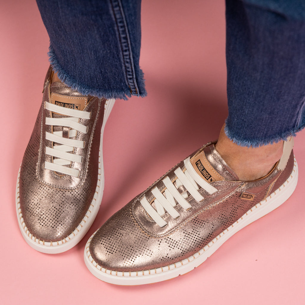 A sneaker with a touch of radiance—Pikolinos brings effortless glamour to off-duty dressing with this metallic leather design. The perforated finish keeps things light, while cream elastic laces and contrast stitching highlight the brand’s signature craftsmanship. A cushioned and moulded insole ensures day-long comfort, making these as practical as they are polished.