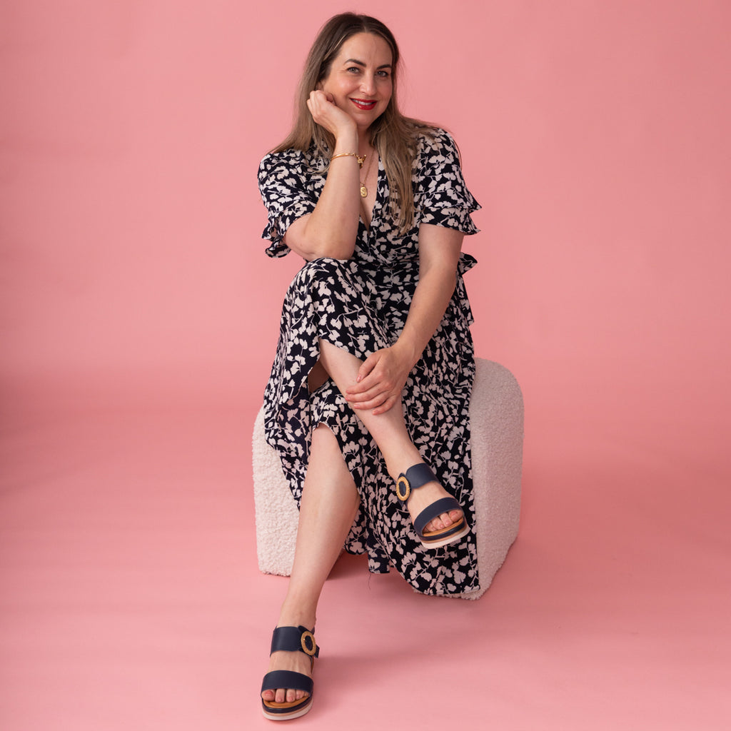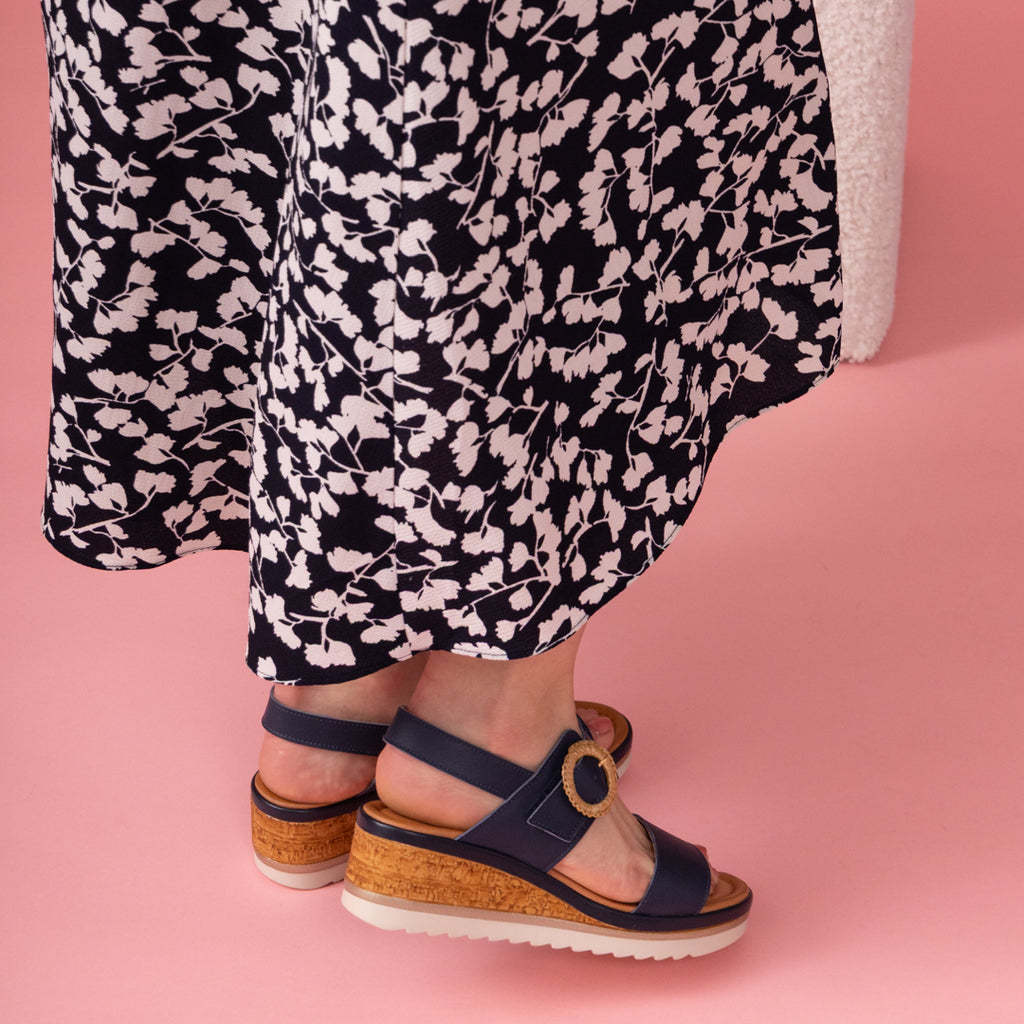 Crafted in Spain, this versatile sandal pairs smooth navy leather straps with a woven statement buckle, adding a touch of natural texture. The lightweight cork wedge offers subtle height, while the soft cushioned footbed and velcro fastening ensure an easy, secure fit for all-day comfort.