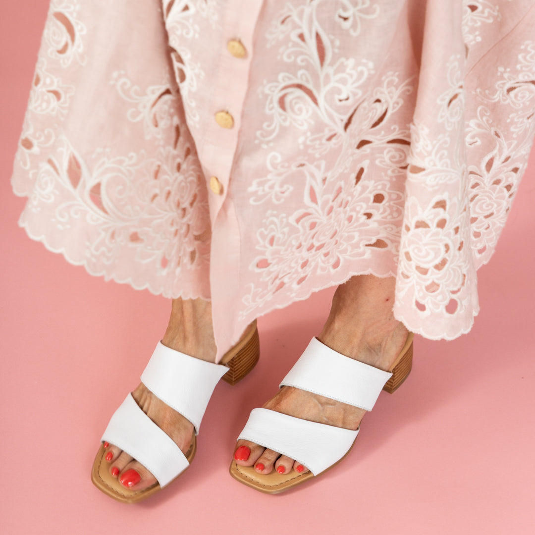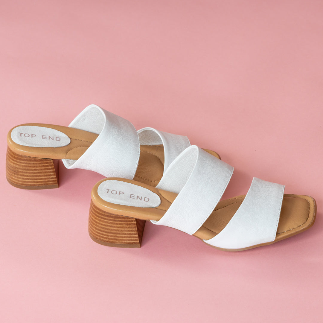 Effortless sophistication meets everyday ease in the Fevello mule by Top End. Crafted in soft white leather, this modern slide features a dual-band design and a sculpted block heel — the perfect balance of simplicity and polish.