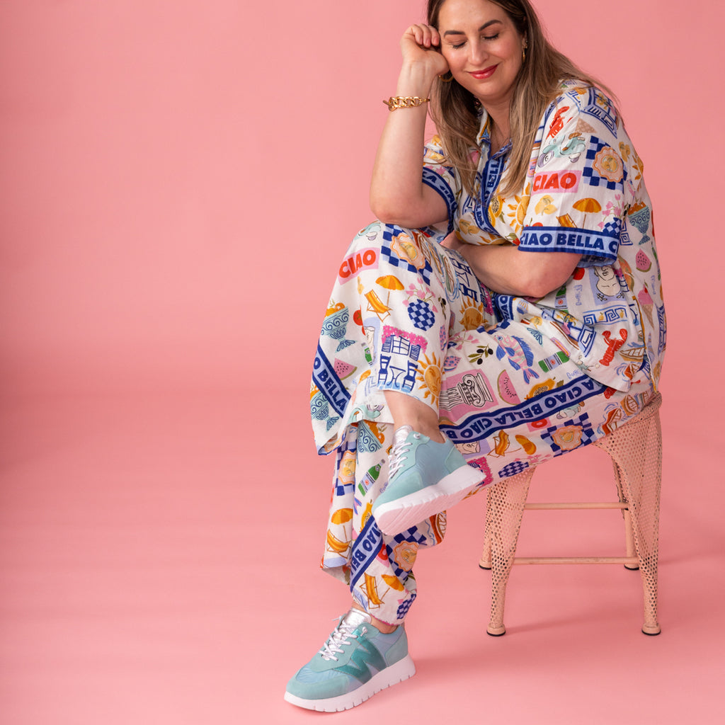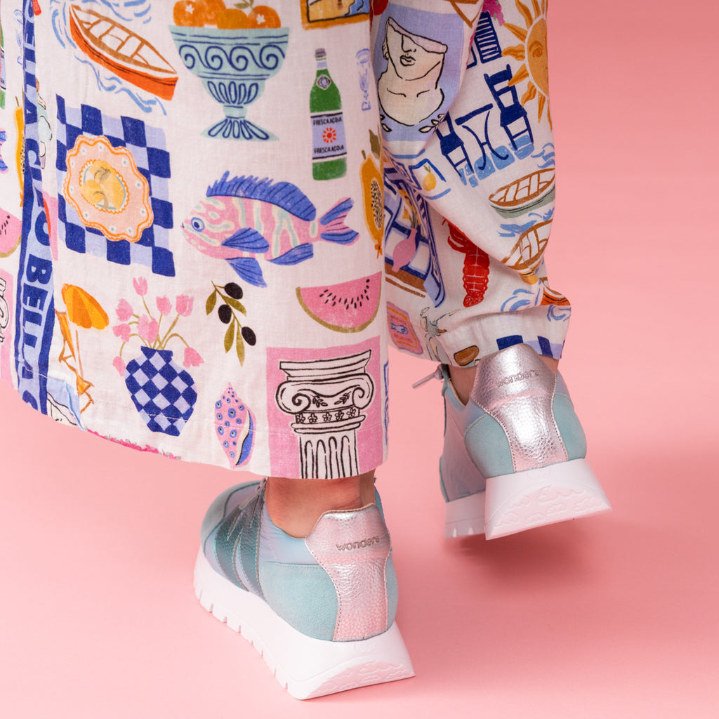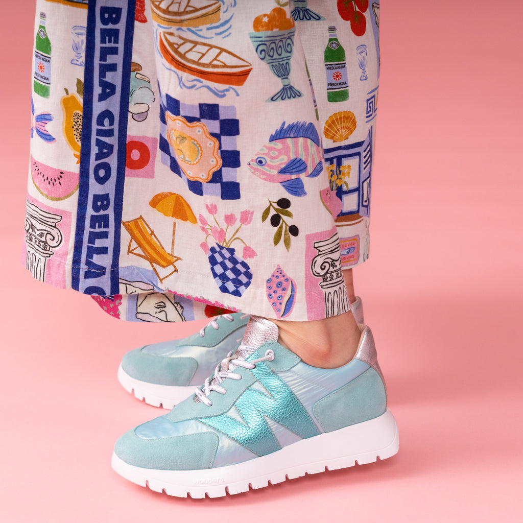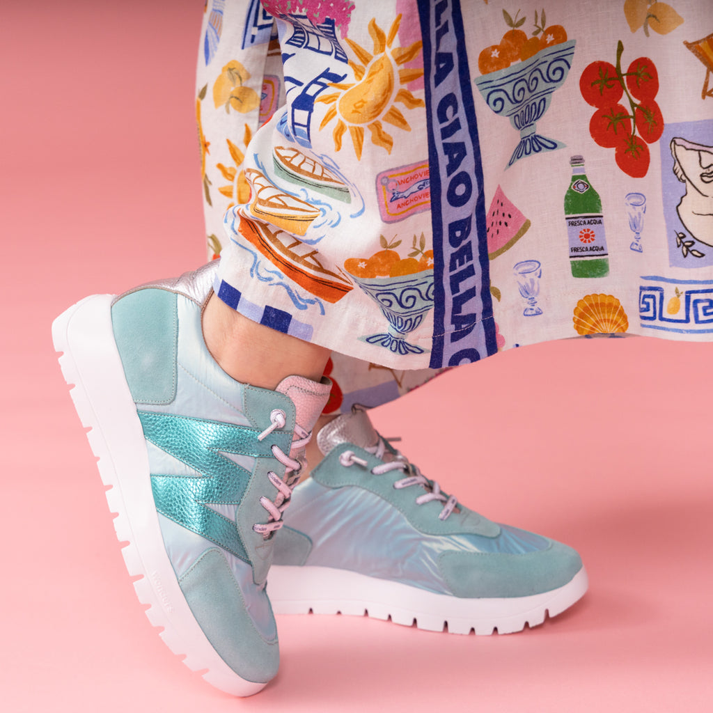 A refreshing blend of style and comfort, these Wonders sneakers bring a modern twist to everyday dressing. Crafted in Spain, they feature a soft aqua palette that dances between leather, suede, material and metallic textures — creating a play of light that feels both playful and luxurious.
